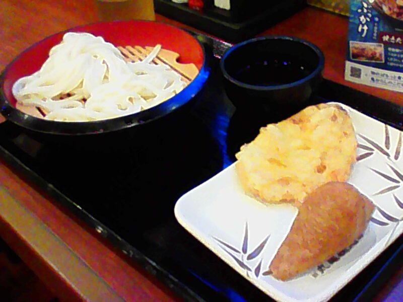食べ物も撮ってみます。ざるうどんと、いなりずしと天ぷらです。