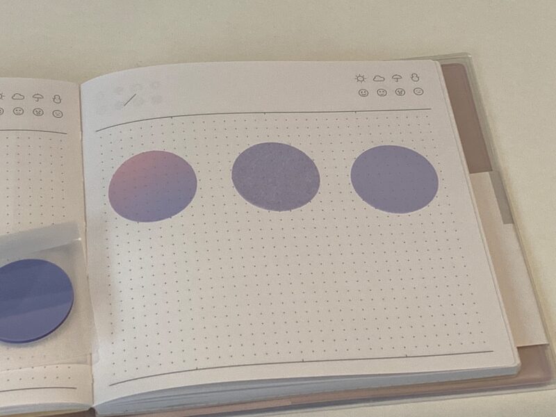 丸いふせんが3つ透明ケースに並んでいる様子は、メイク道具のパレットみたいな印象もあり、かわいいデザインだなと思いました。