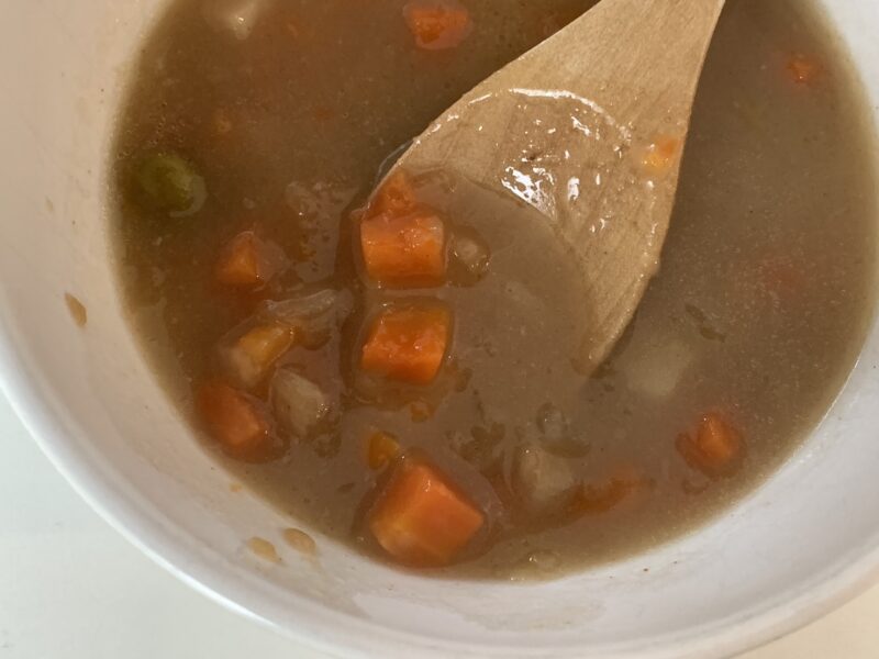 スプーンをいれてみると、小さく刻まれたニンジンやグリーンピースなどたくさんの野菜が入っていることがわかります。