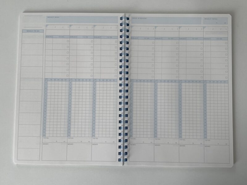ページを開いてみると、1週間の勉強の計画や、どれくらいの時間取り組んだのかを記録することができるレイアウトになっています。