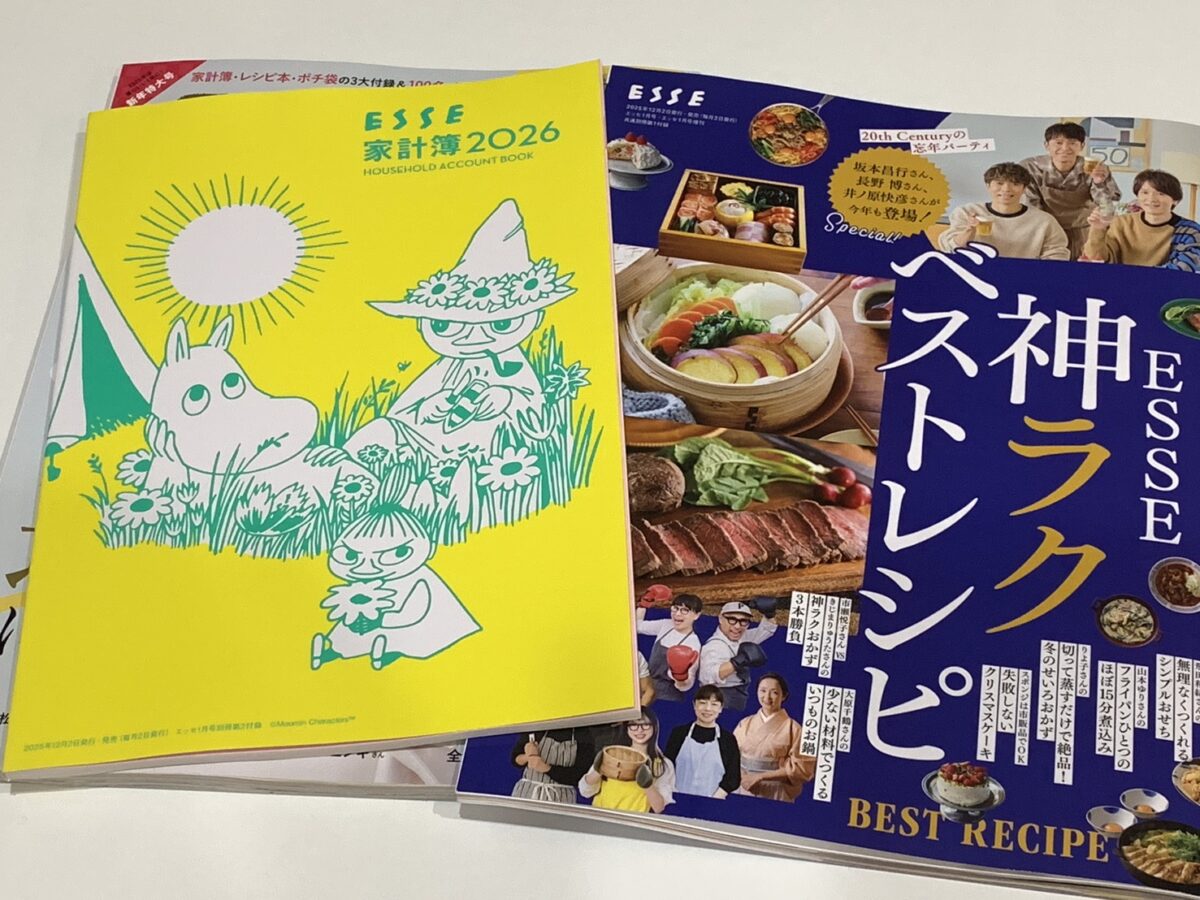 「ESSE(エッセ)」2026年1月号には、ムーミン家計簿2026と、ESSE神ラクベストレシピBOOKがついてきました。