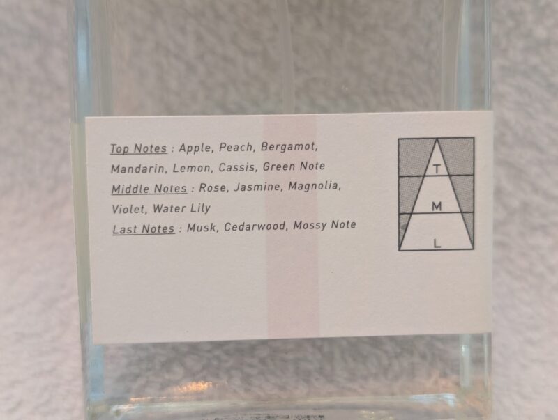 となっています。個人的にはトップノートはペアーが近いかな。微かな酸味と柔らかい甘みの調和。