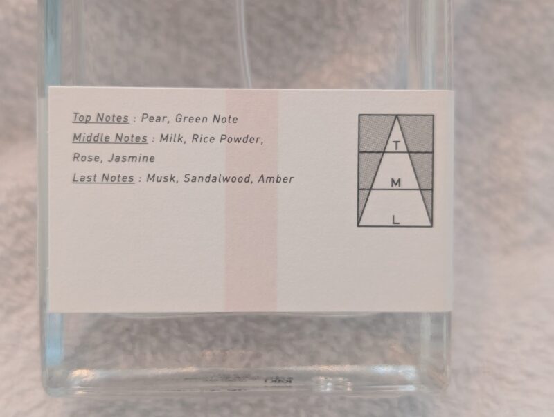 スプレーの部分から香るのは強いムスクを感じる香り。実際につけてみると、ミドルノートから、果実~花の甘く優しい香りに代わります。