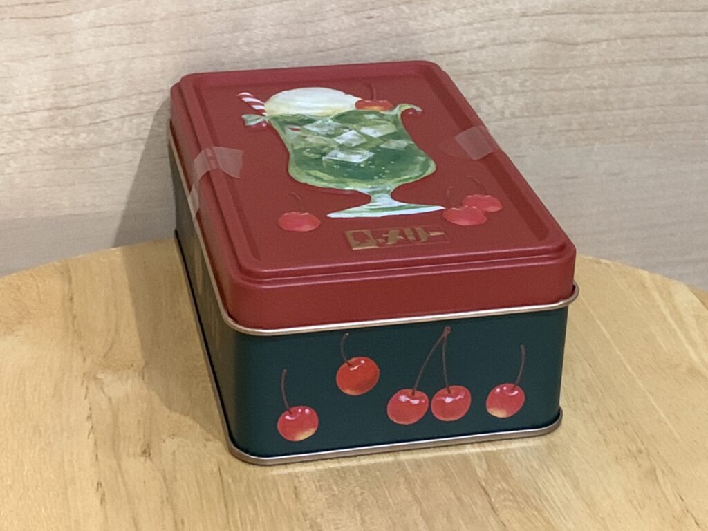 小さい缶の今年のデザインは、赤いふたに緑の容器。缶の側面にも、サクランボが描かれていてとてもかわいいです。