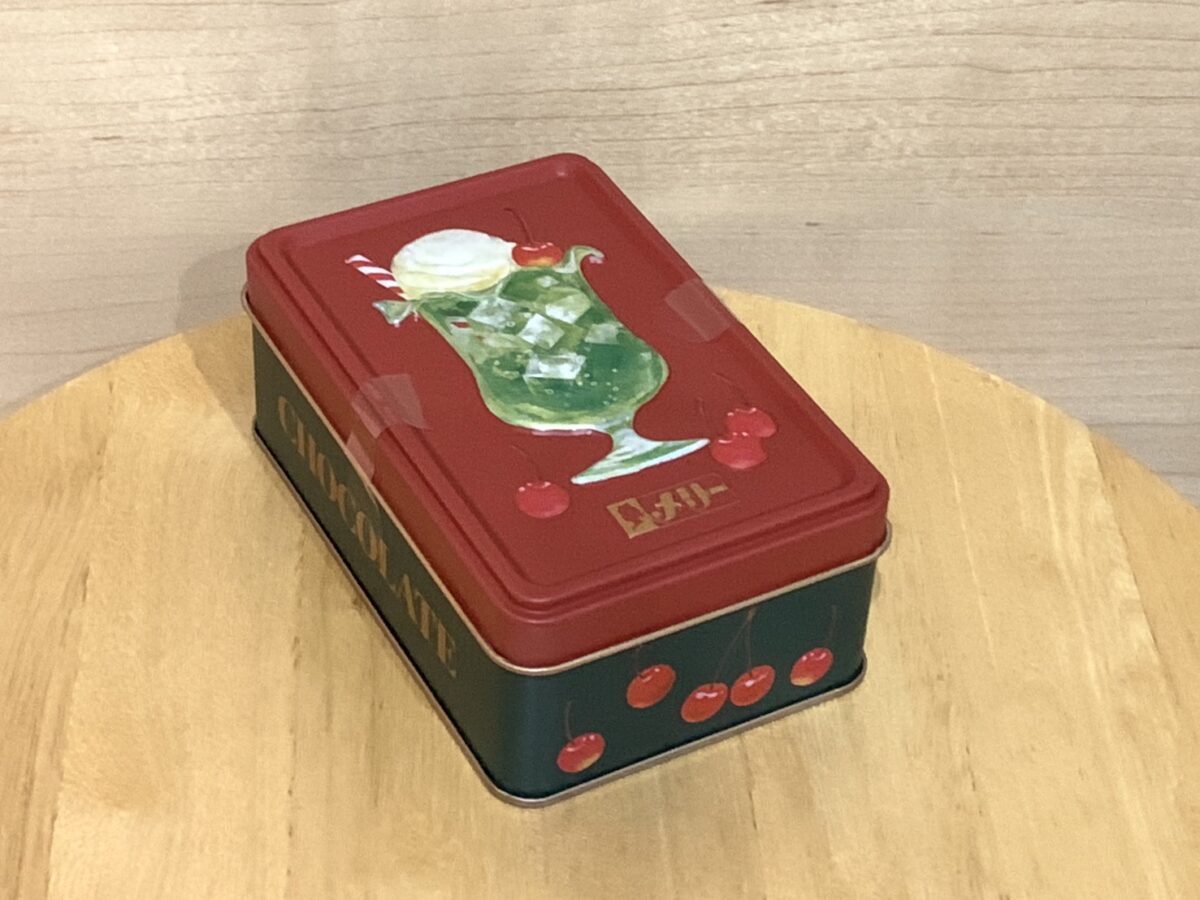 チョコが入っている缶のデザインが、レトロなクリームソーダのイラストで、とてもかわいいんです。