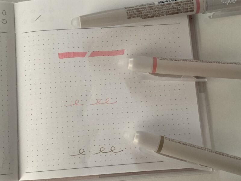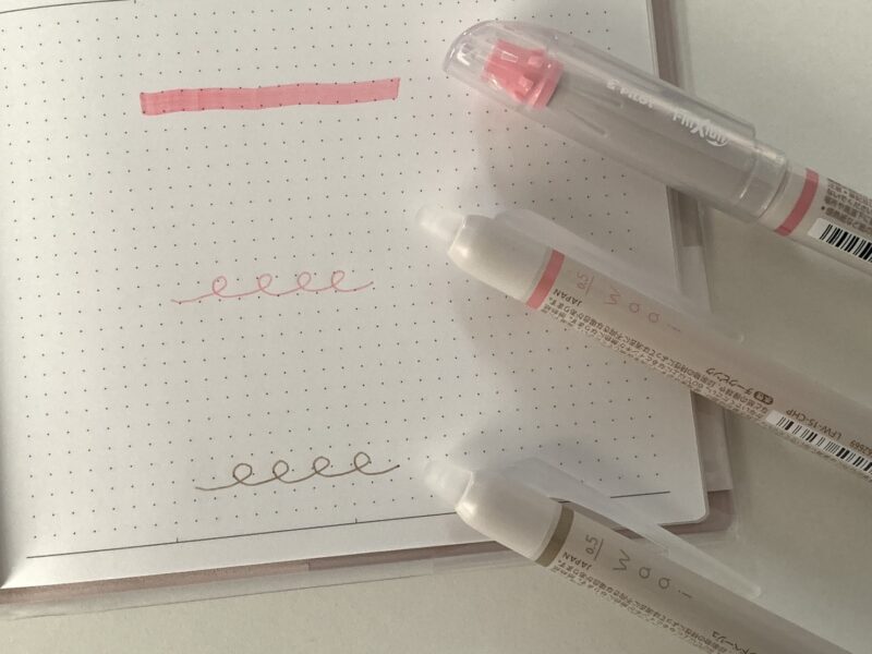 マーカーがコーラルピンク、ボールペンはチークピンクとサンドベージュです。