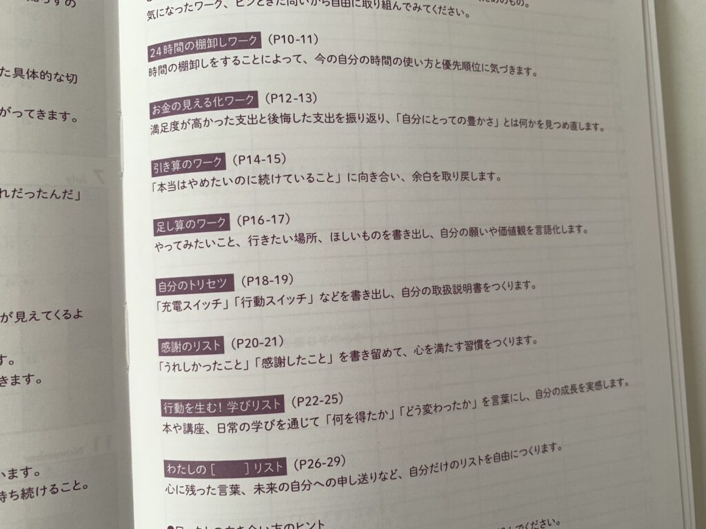 24時間の棚卸しワーク、お金の見える化ワーク、引き算のワークなど。書き込めるページがたくさんあります。