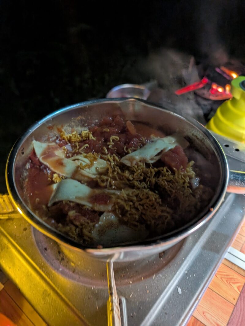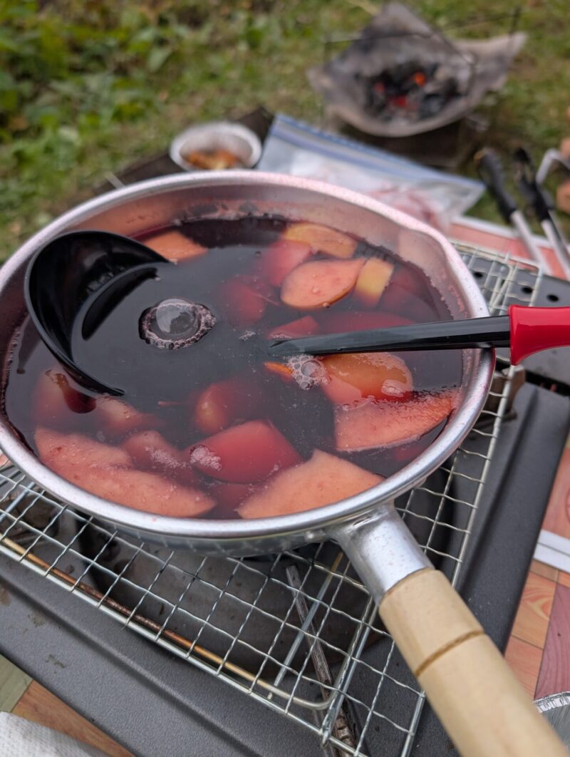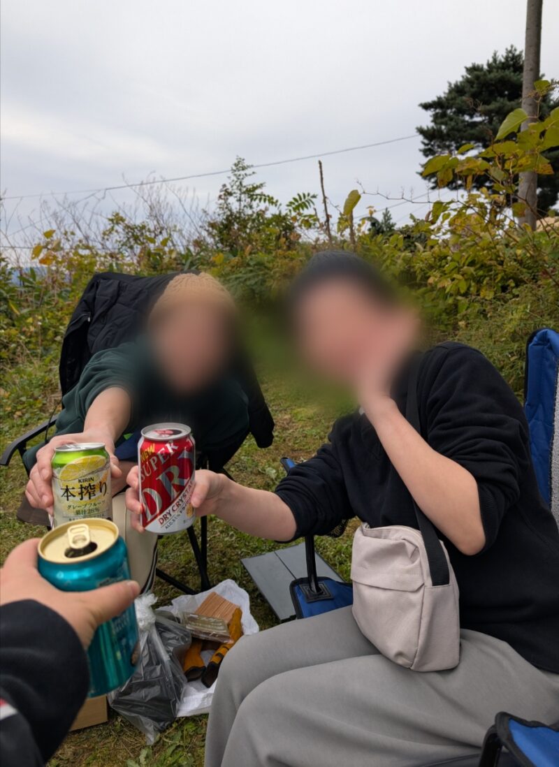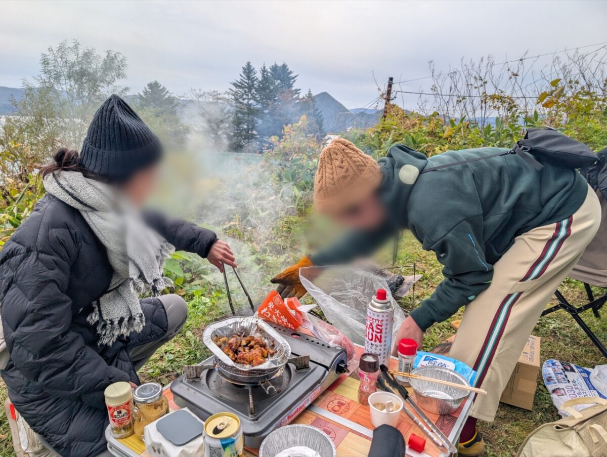 焚火をしながらホットワイン、焼き肉、チキンラーメンなど外気が寒いからこそ楽しめるメニューがあるのでそれを楽しみ、穏やかな消灯を迎える。洞爺の夜は札幌に比べると幾分か暖かく感じ、夜間はとても過ごしやすかったです。