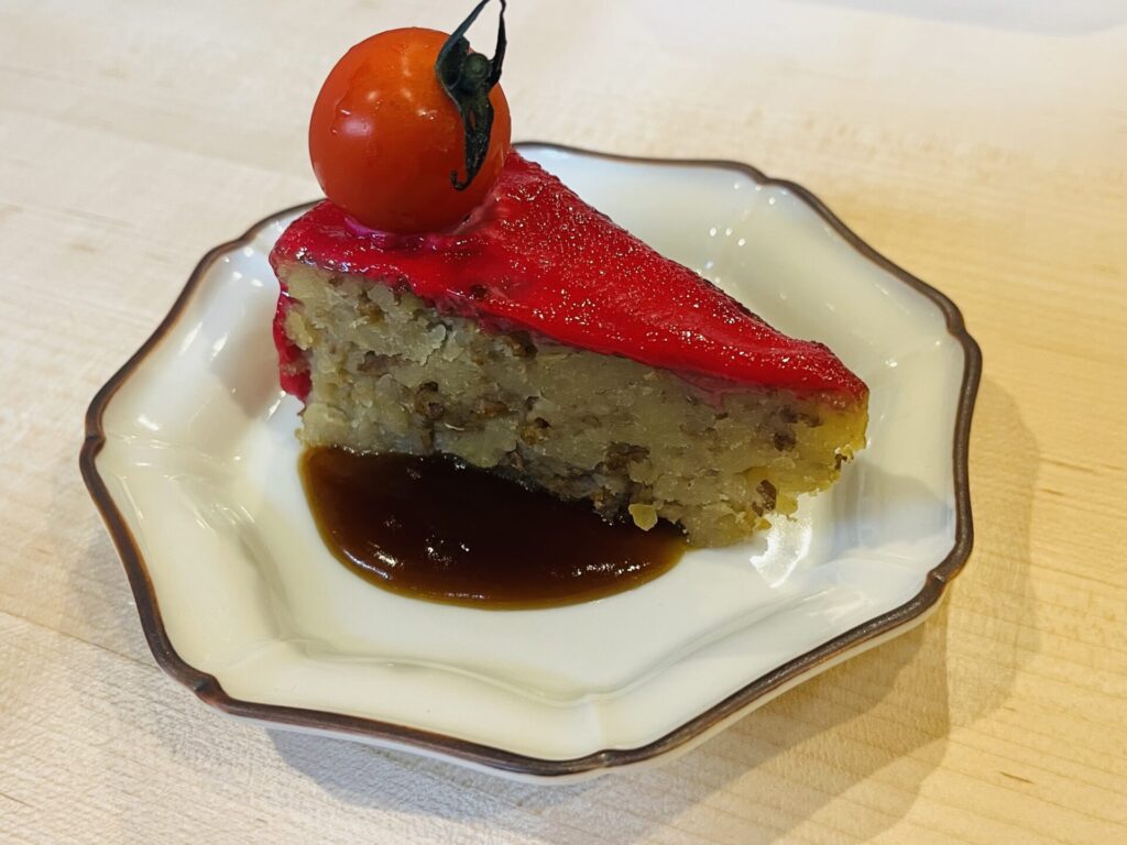 じゃがいもは北あかり、和牛の旨みと玉ねぎの甘み、特製ビーツソースで彩った渾身の一皿。一見、ケーキにしか見えない可愛すぎる肉じゃが。