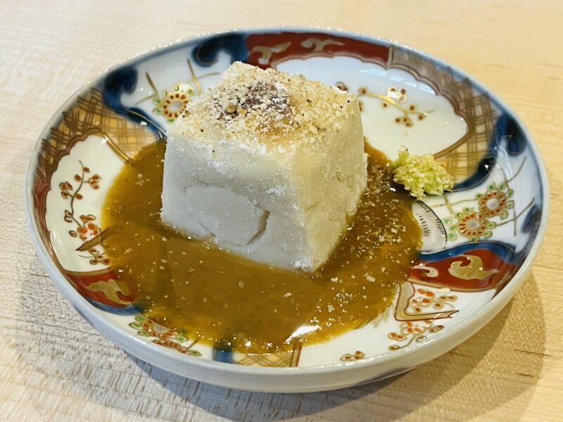 お店の自家製豆腐。絶妙な焼き加減とグルテンフリーの胡麻だれで香りと食感を楽しみながらいただきます。