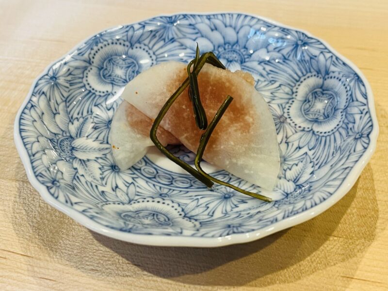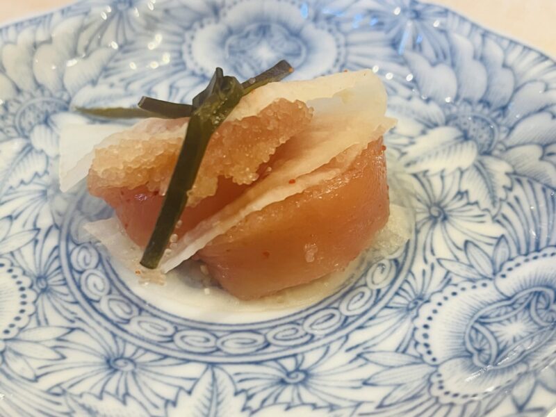 昆布で締めて旨みを引き出した無添加辛子明太子に、米麹で漬けた自家製千枚漬けを添えた一品。