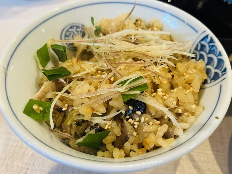 脂ののった秋刀魚ときのこの旨みたっぷりのご飯。大葉とミョウガのアクセントも相性抜群。
