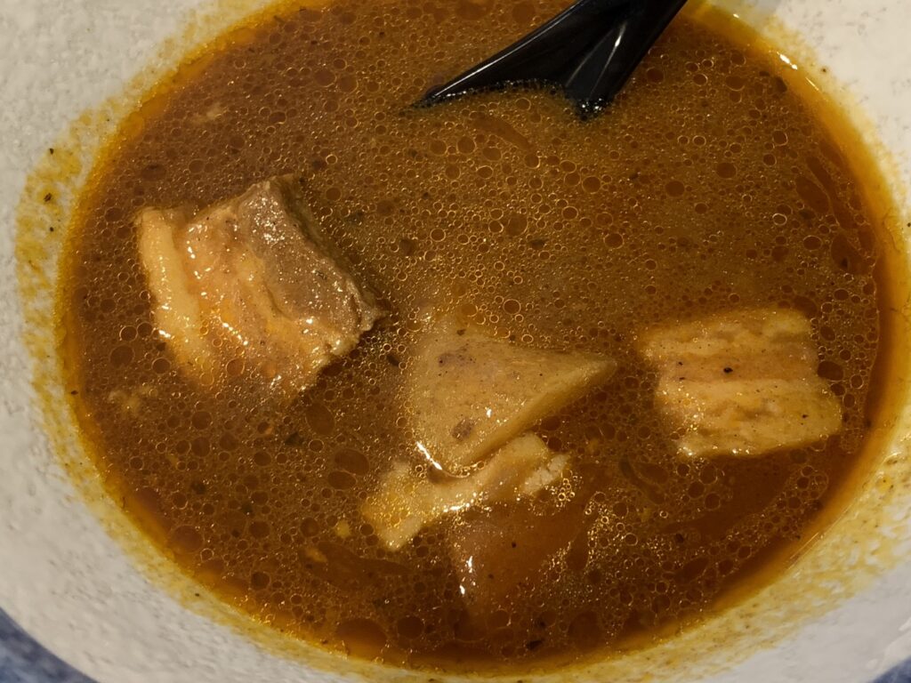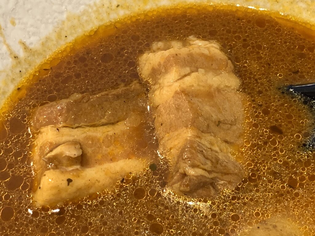スープを一口。美味しい。辛さはそこまできつくなく、食べやすかったです。パッケージに表示された辛さの目安は5段階中の3番目でした。ほどよいスパイスで、そんなにクセがなく食べやすい印象でした。
