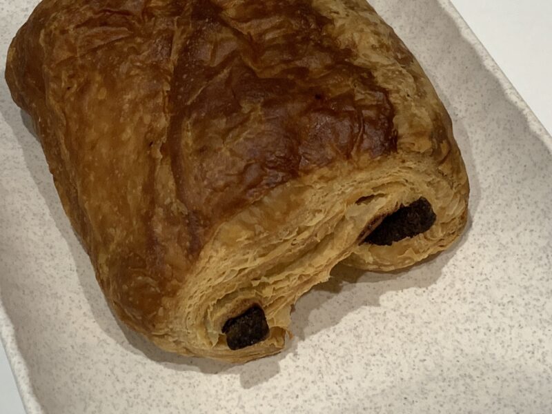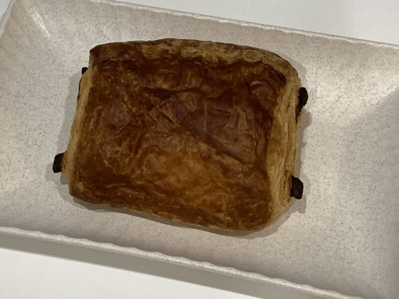 「パン・オ・ショコラ」ってどんなパンなんだろうと調べてみると、フランス発祥のパンで、2筋の棒状のチョコレートが包まれているクロワッサン生地の四角いパンだそうです。
