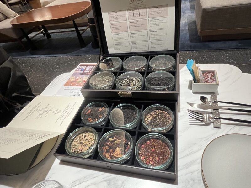 ファーストドリンクは紅茶をチョイス。12種類の茶葉が宝石箱のようなケースに並べられていて、香りや茶葉の特徴を見ながら選ぶことができます。