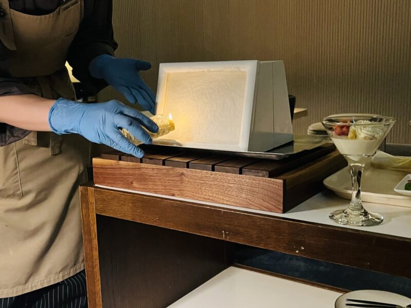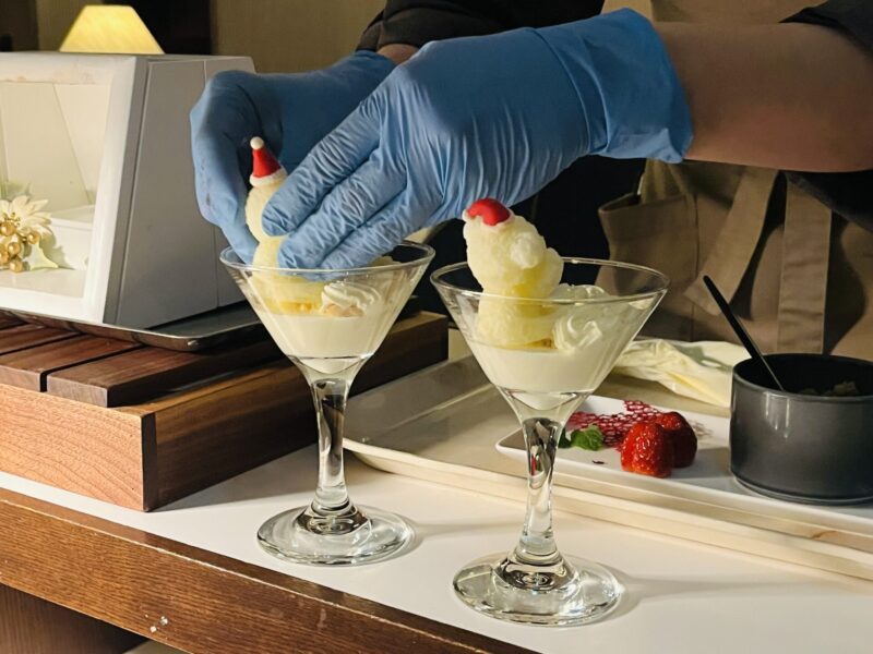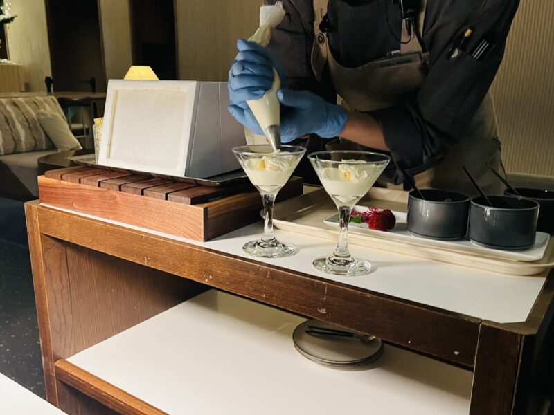 パティシエさんがテーブルで仕上げてくれる「ライブデザート」では私たちとコミュニケーションをとりながら見事なパフォーマンスで楽しませてくれます。
