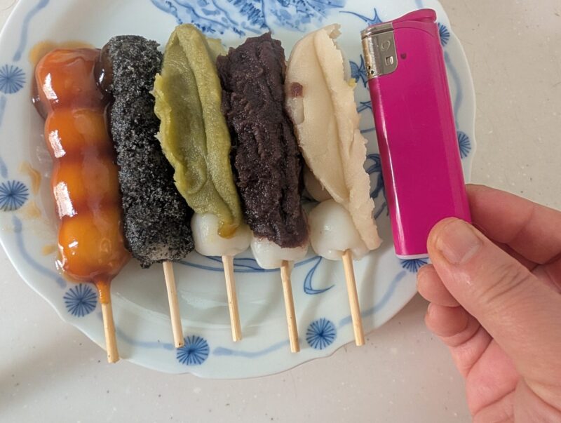 今回は定番の「黒あん、白あん、抹茶あん、胡麻、お正油」を頂きました。