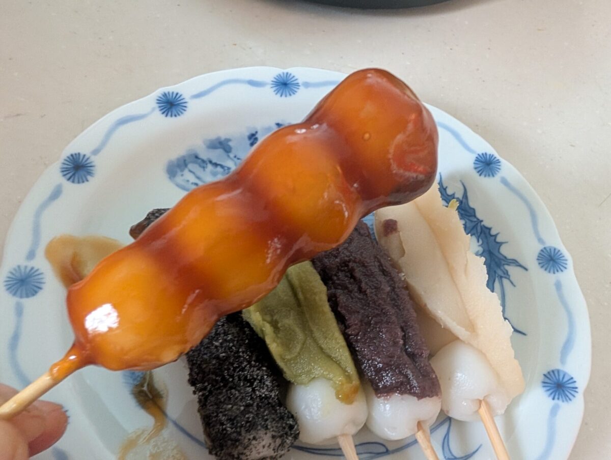 まずは正油団子から。しっかりとした味のみたらしに優しくとろけそうなくらいモチモチ。ほのかにあまーい餅とたれがからんで、甘じょっぱい幸せが口の中を追いかけまわしてくる、逃がしてくれない。