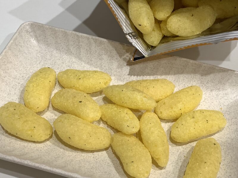 コーンポタージュを感じさせるやさしい黄色のスナックが見えます。