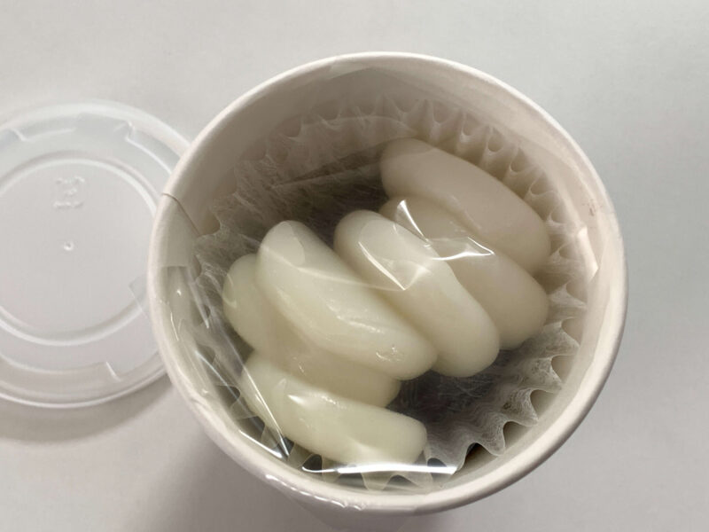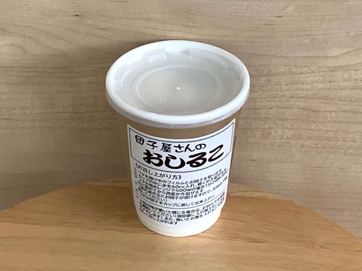カップの蓋をあけると、白くて平たいお餅がはいっていました。