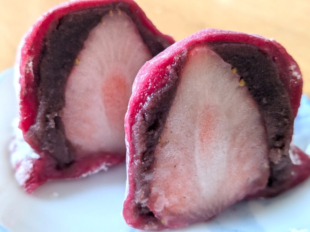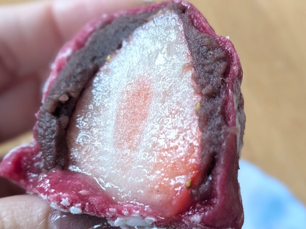 最近のいちご大福界ではいちごが大福から顔を出しているタイプがメジャーな気がしていますけども、こちらは、赤く色づいた餅の中にいちごを忍ばせているタイプ。
