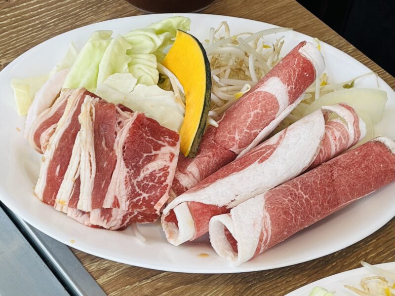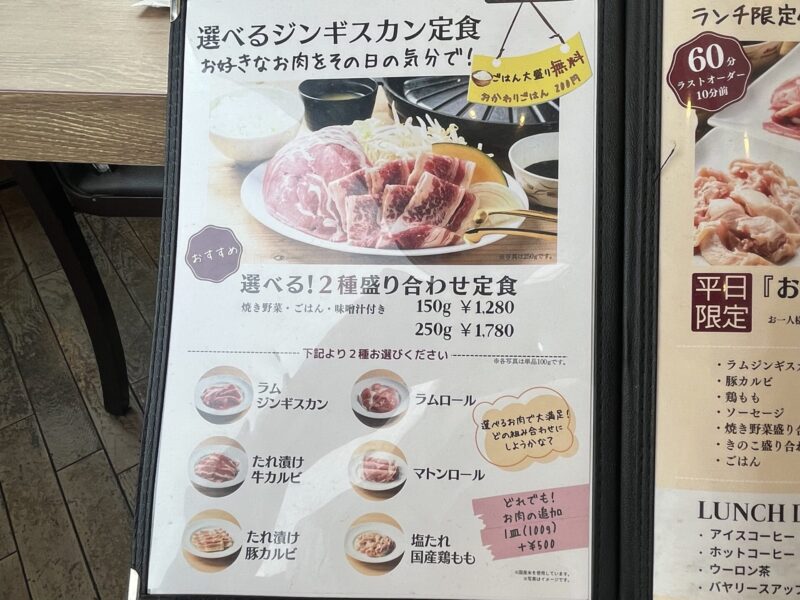 今回は「選べるジンギスカン定食」をチョイス。6種類のお肉の中から2種類選ぶスタイル。