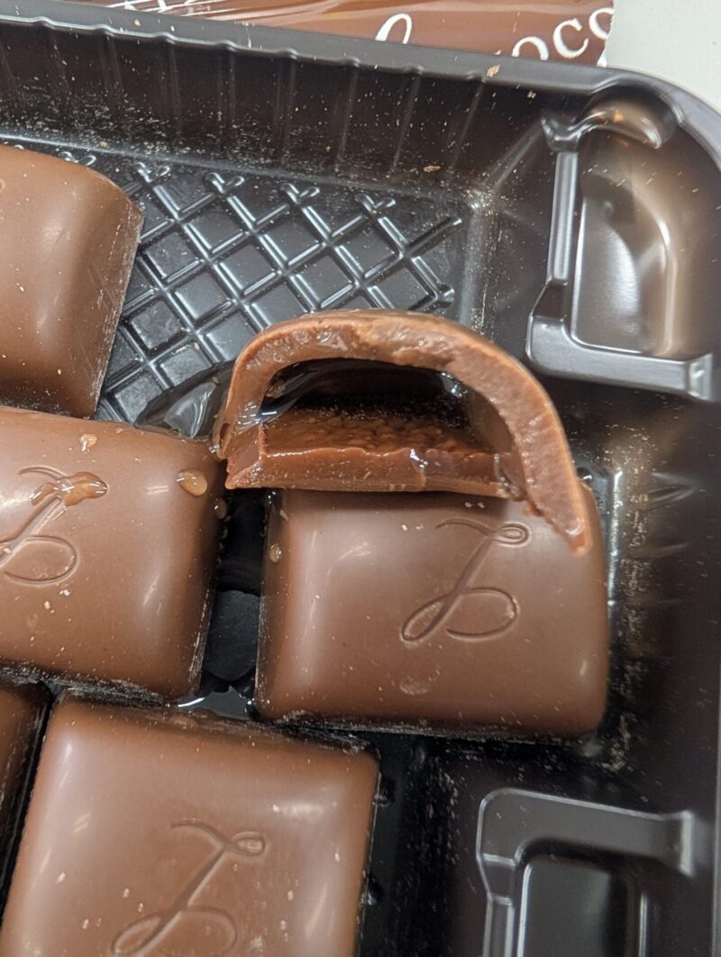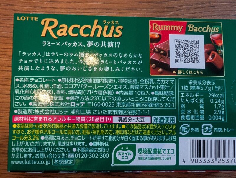 たしかに、バッカスのチョコの中にラミーの味が入ってる。レーズンを使っていないため、その味を強調するためにレーズンエキス、濃縮マスカット果汁が入っているんだろうな。味は忠実。