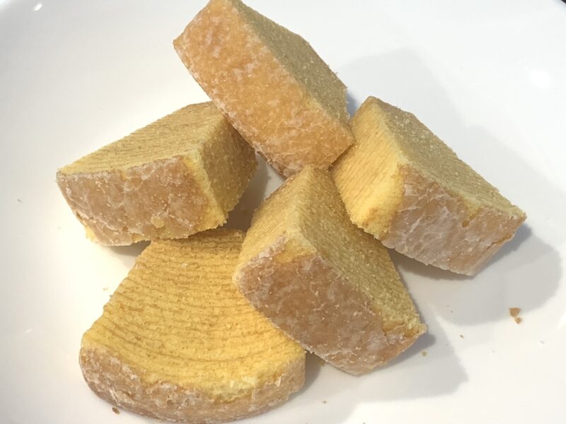 バウムクーヘンの外側に、薄く砂糖がかかっていておいしそうです。