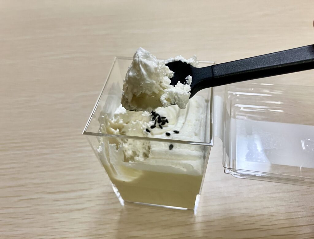 生クリームはオーソドックスな味で甘さはほぼありません。ゆるいペースト状のさつまいもは、自然な甘さでありながらしっかりとさつまいもを感じます。ごま、生クリーム、さつまいもペーストを一緒に食べると、ごまの香ばしさも加わって良いアクセントに。後味にうっすらと洋酒のほろ苦さが見え隠れし、大人の味わいです。