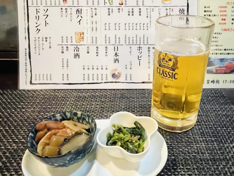 メニューはゆっくり選ぶとして、まずはビール。この日のお通しはこちらの2種。