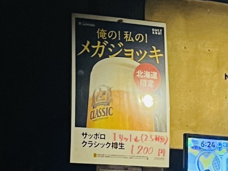 「俺の!私の!メガジョッキ」サッポロクラシック樽生1リットル(2.5杯分)¥1,200