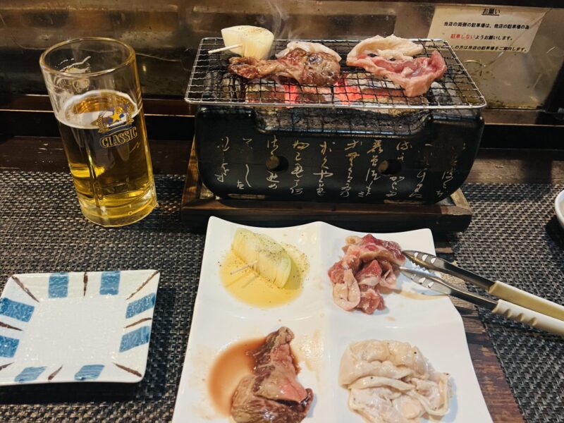 なんとこちら、ミニ七輪がカウンターに出てきて自分で焼くスタイル。楽しい!それぞれの肉の味付けも程よく馴染んでいて美味しいです。カウンターでの七輪焼肉満喫。