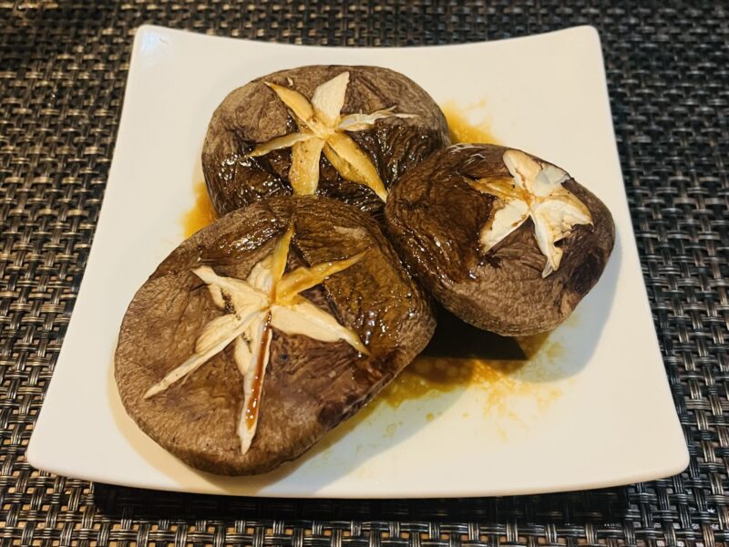 炭火焼きのしいたけは自分的にマストです。囲炉裏でじっくりと火を入れていく過程を見ながら待つのが心地よい。大きめのしいたけは食べ応え十分。