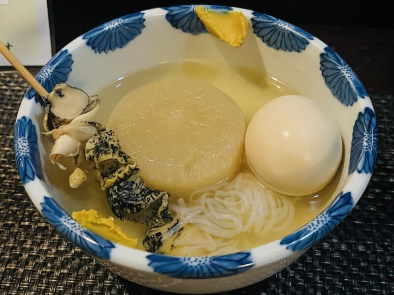 おでんに辛子ってなぜこんなに合うのだろう…などと考えつつ、お出汁がたっぷりしみたおでんを美味しくいただきます。