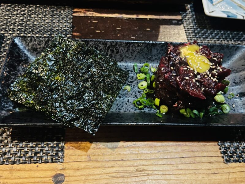 最後におすすめを何点か教えていただき、その中からくじらのユッケをオーダー。釧路はかつて捕鯨の基地として栄え、新鮮なミンククジラが水揚げされる「捕鯨の町」だそうです。