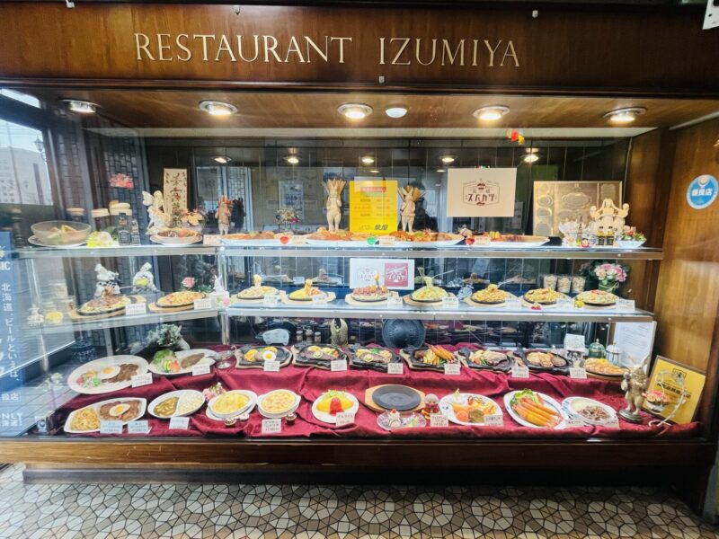 昔ながらの食品サンプルがずらり、迫力満点のショーケースが食欲をそそります。