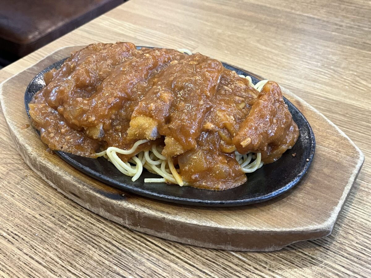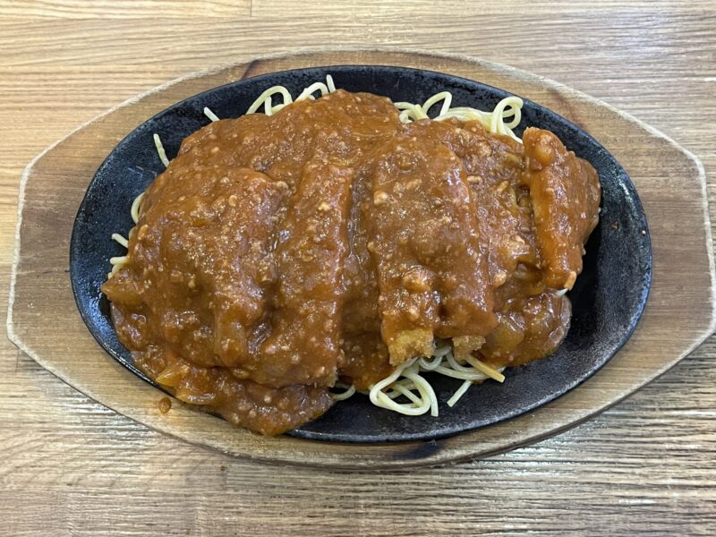 「スパカツ」とは、熱々の鉄皿で提供される、太麺のミートソースパスタにトンカツを乗せたボリューム満点の料理。人気の釧路ソウルフードのひとつです。