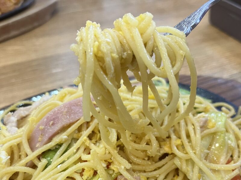 麺はスパカツよりもかためな仕上がり。たっぷりの炒り卵がしっかり絡んでいて食べ応えじゅうぶん。