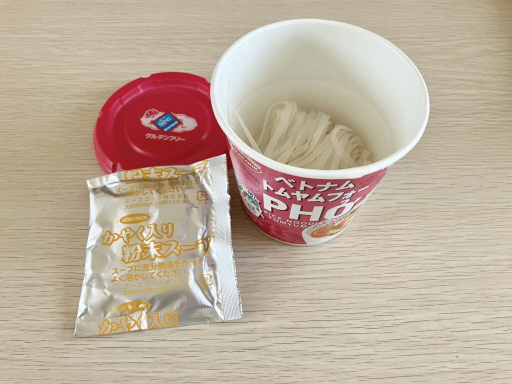 かやくスープとフォーのみ。袋を開けてカップに入れ、お湯をそそいだら3分という手軽さがいいですね。