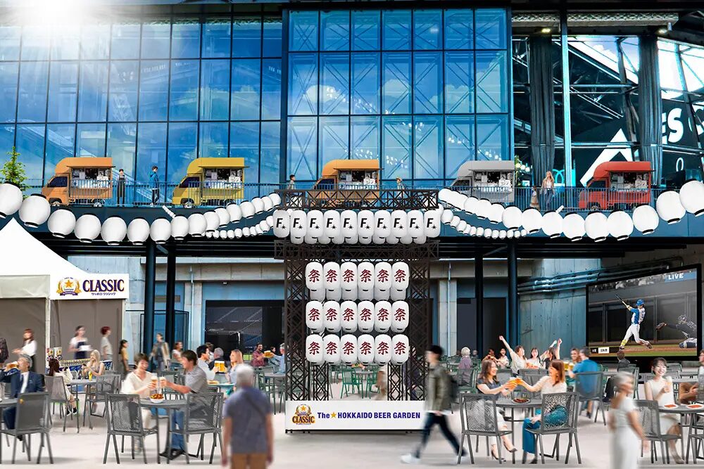 北海道ボールパークFビレッジで、初となるビアガーデン「The☆HOKKAIDO BEER GARDEN in F VILLAGE」が開催されます。会場では、今年で40周年を迎えた「サッポロ クラシック」をはじめとする各種ドリンクが提供され、大型ビジョンではファイターズの試合観戦も可能です。