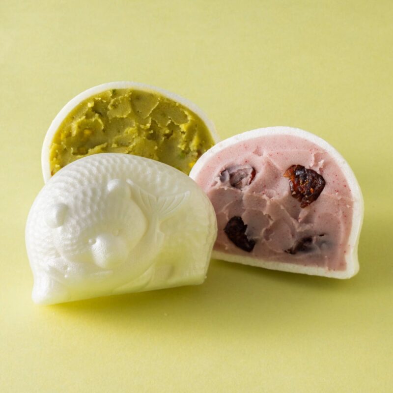 白餡に甘酸っぱいクランベリーを混ぜ込み、ピスタチオ餡と合わせました。