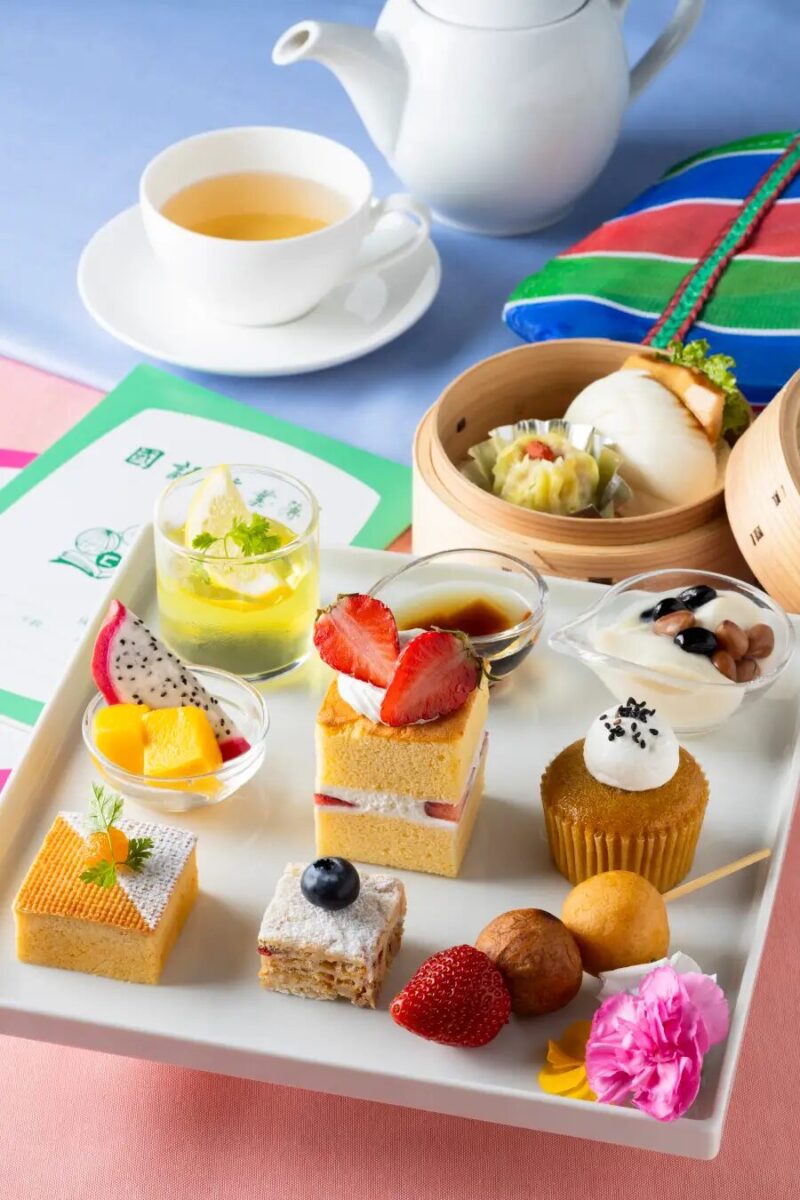 スイーツは檸檬愛玉子(レモンオーギョーチ)や豆花、台湾カステラショート、パイナップルケーキ、マンゴーとドラゴンフルーツなど、南国らしいラインナップ。セイボリーには飲茶を用意し、ドリンクはジャスミン茶やウーロン茶、ロンネフェルトティー、コーヒーなどから選べます。