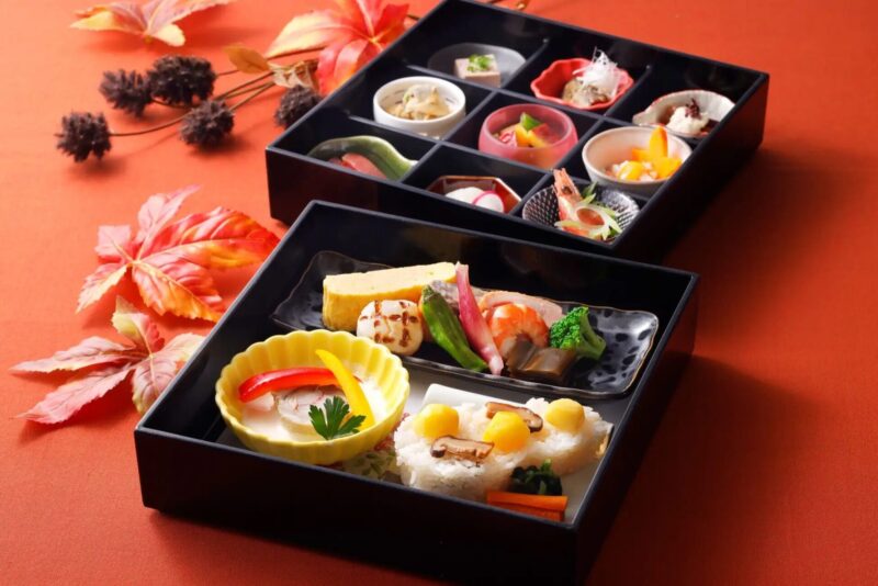 35階のスカイレストラン「丹頂」では、さつま芋の揚げ浸しや栗ご飯を盛り込んだ「秋彩弁当」を用意。海と山の旬の恵みを詰め込んだ二段重ねのお弁当です。