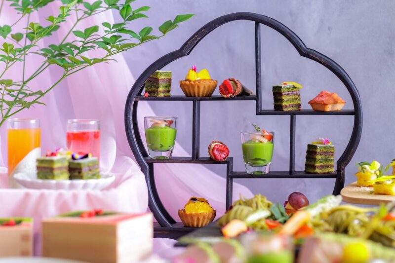 ブッフェには、抹茶とチーズを組み合わせた「抹茶のチーズケーキ」、抹茶とゆずを合わせた和風アレンジの「抹茶のオペラ」、紫蘇を練り込んだフランボワーズムースに抹茶クリームを重ねた「ミニパフェ」など、個性豊かなスイーツが勢ぞろい。見た瞬間に心が弾むラインナップです。
