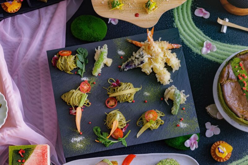 料理長・山本昭典シェフによる、抹茶を取り入れた和洋多彩なメニューも登場。揚げたて天ぷらを抹茶塩で味わい、さらに出汁を注いで「だし茶漬け」として楽しめる一品や、「抹茶チーズと青のりのカルボナーラ」など、ここでしか味わえない料理が並びます。