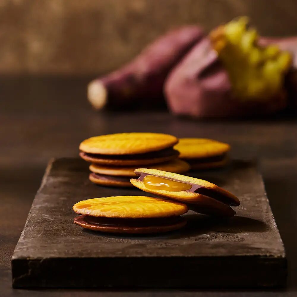 さつま芋のパウダーとペーストをバターと生クリームで炊き上げ、とろけるキャラメルに仕上げた一品。ミルクチョコレートで包み、さつま芋の香り豊かなバタークッキーでサンドしました。スイートポテトならではの香ばしさとほっくりした甘みに、バターと生クリームのコクが重なり、上品な余韻を残す味わいです。