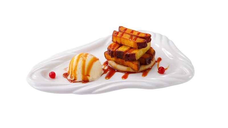 フライドスイートポテト(単品/コーヒーセット)は、揚げたてのさつまいもスティックにカスタード風バニラアイスを添えた温冷コントラストが魅力のケーキデザートです。こだわりのコーヒーと一緒に味わえるセットも用意され、ホットコーヒー(シングルオリジン・ブレンド)とアイスコーヒーS(シングルオリジン・ブレンド)の中から選べます。