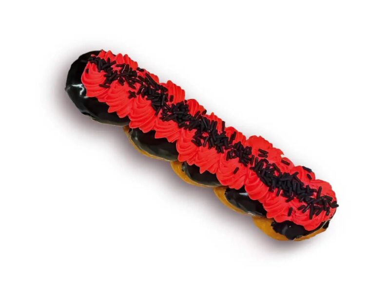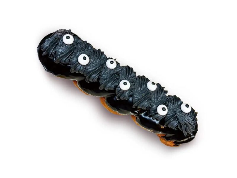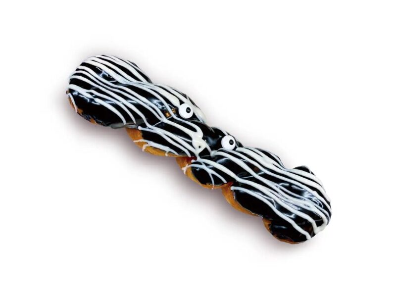 黒ベースをホワイトチョコで包帯のようにデザインした“黒のミイラ”。キュートな“目玉”がアクセントになった、遊び心満点のハロウィンドーナツ。