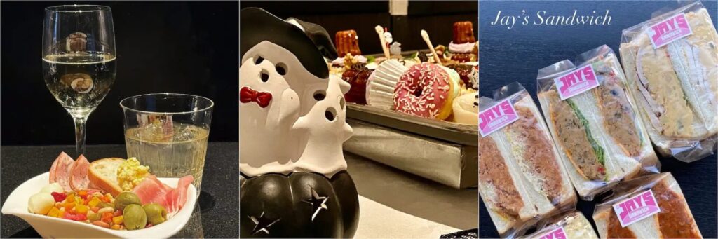 オードブルビュッフェは、ディアブロチキン、ニョッキとベーコンのパンプキンパイ、ハロウィンカラーのサラダ、生ハムやシャルキュトリ、三種のきのこマリネ、海老のガーリックフリチュール(トマトガーリックソース)、七種野菜のキッシュ、ポテトフライ、鶏の唐揚げ、キッズ向けのハロウィン菓子、マシンで焼き上げるミニパンケーキまで豊富にそろいます。飲み放題は、赤・白・スパークリングの各種ワイン、生ビール(サッポロクラシック)、カクテル、ハイボールのほか、烏龍茶やオレンジ、アップル、ジンジャーエール、コーラ、ファンタメロン、コーヒー、紅茶などのソフトドリンクも充実しています。別料金で、アメリカ南部風サンドイッチで人気の「Jay’s Café」によるサンドイッチ出店もあります。