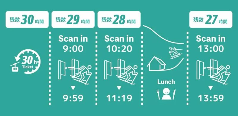 初回のゲート通過時にICリフト券から1時間が減算され、その時点から1時間は何度でもゲート通過が可能。以降も1時間ごとに減算され、合計30時間分を利用できます。日付をまたいで組み合わせられるため、シーズンを通して自分のペースで効率的に滑れます。